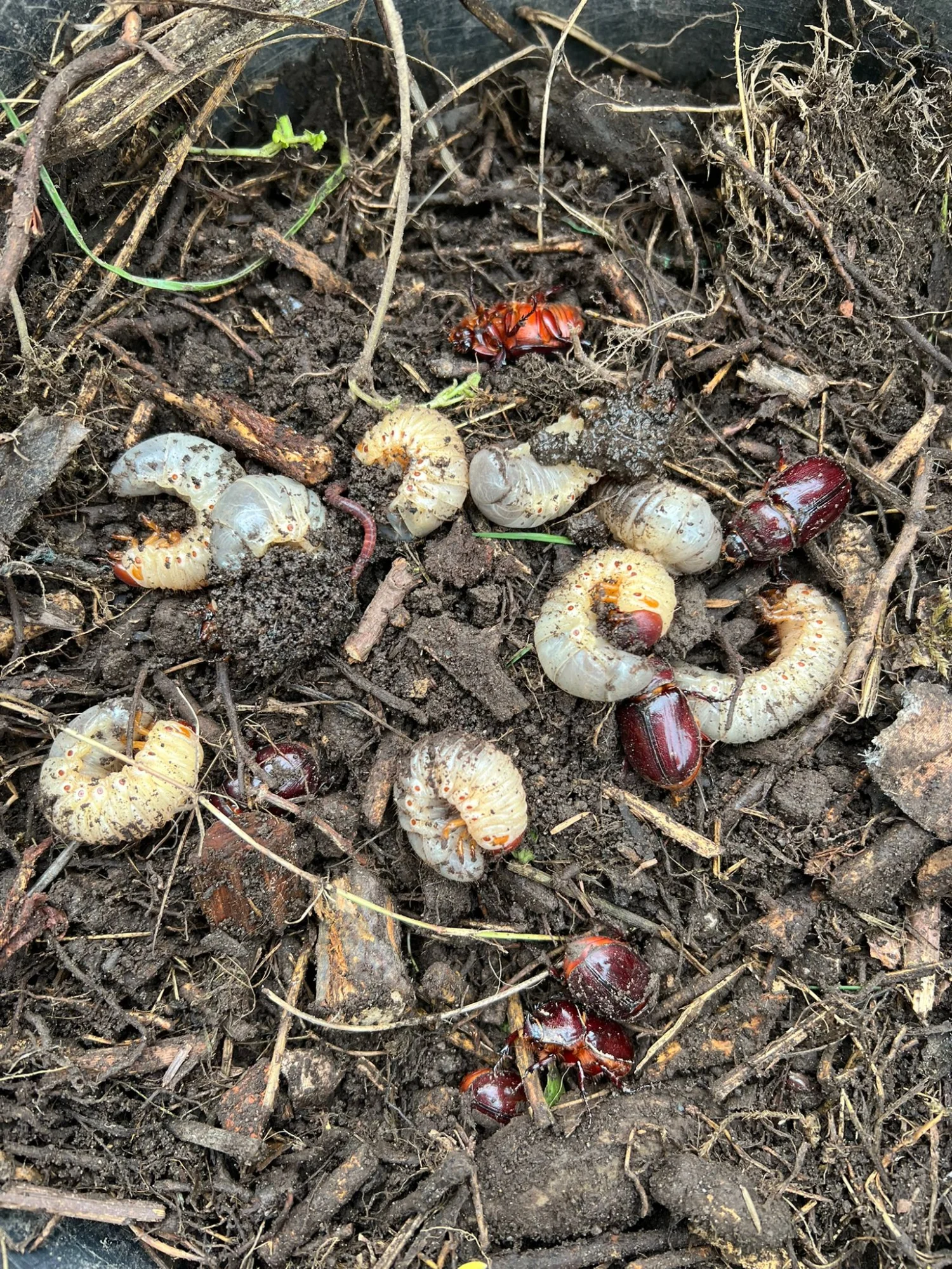 Laut Tante Gockel sind das Nashornkäfer. An der Unterseite sollen rotorange Härchen sein und die Größe 2 - 4 cm betragen. Passt das? Da ich keinen mit Horn sehe, müssten es nur Weibchen sein, das wundert mich.