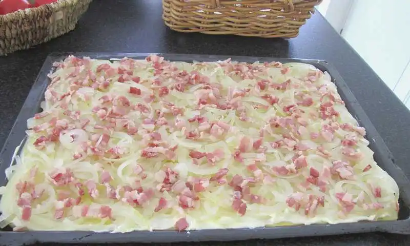 Ich habe neulich mal einen "Flammekuchen" gemacht, ist ganz aehnlich wie Zwiebelkuchen, aber mit einer Art Muerbeteig oder so! War seeehr gut!