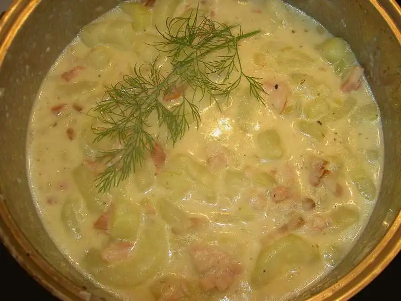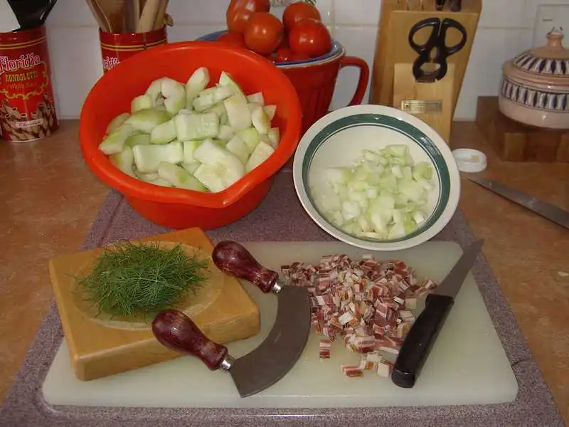 Mageren Speck (Rauchfleisch, geraeuchertes Buendle, Doerrfleisch oder wie immer das bei euch heisst) schneide ich in kleine Wuerfel, ebenso wie eine (oder mehr) grosse Zwiebel(n). Schmorgurken Av.webp Beides brate ich in Fett an, bis sie glasig sind (nicht braun!), dann die Gurkenstuecke dazu, kurz mitschmoren, Schmorgurken Av (1).webp (AM Besten probieren, wie weich Du die Gurken haben moechtest)mit Salz, Pfeffer bisschen Zucker und evtl. Citronensaft abschmecken. Falls es zu trocken ist, ein bisschen Wasser dazugiessen. Ich dicke das Ganze nicht an, Schmorgurken Av (2).webp Du kannst es aber mit angeruehrter Speisestaerke (Maizena, Mondamin oder so) leicht andicken. Saure Sahne nach Geschmack reinruehren und ganz zum Schluss (nicht mehr mitkochen,!!!) gehackten Dill unterruehren. Schmorgurken Av (3).webp