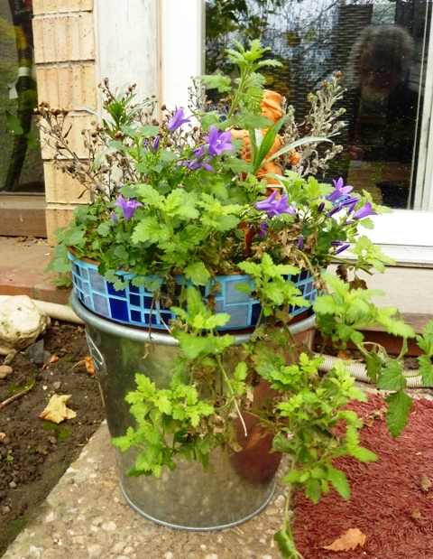 Zeig mal gerade das Gefäß; die blauen Astern sind allerdings schon alle verblüht.