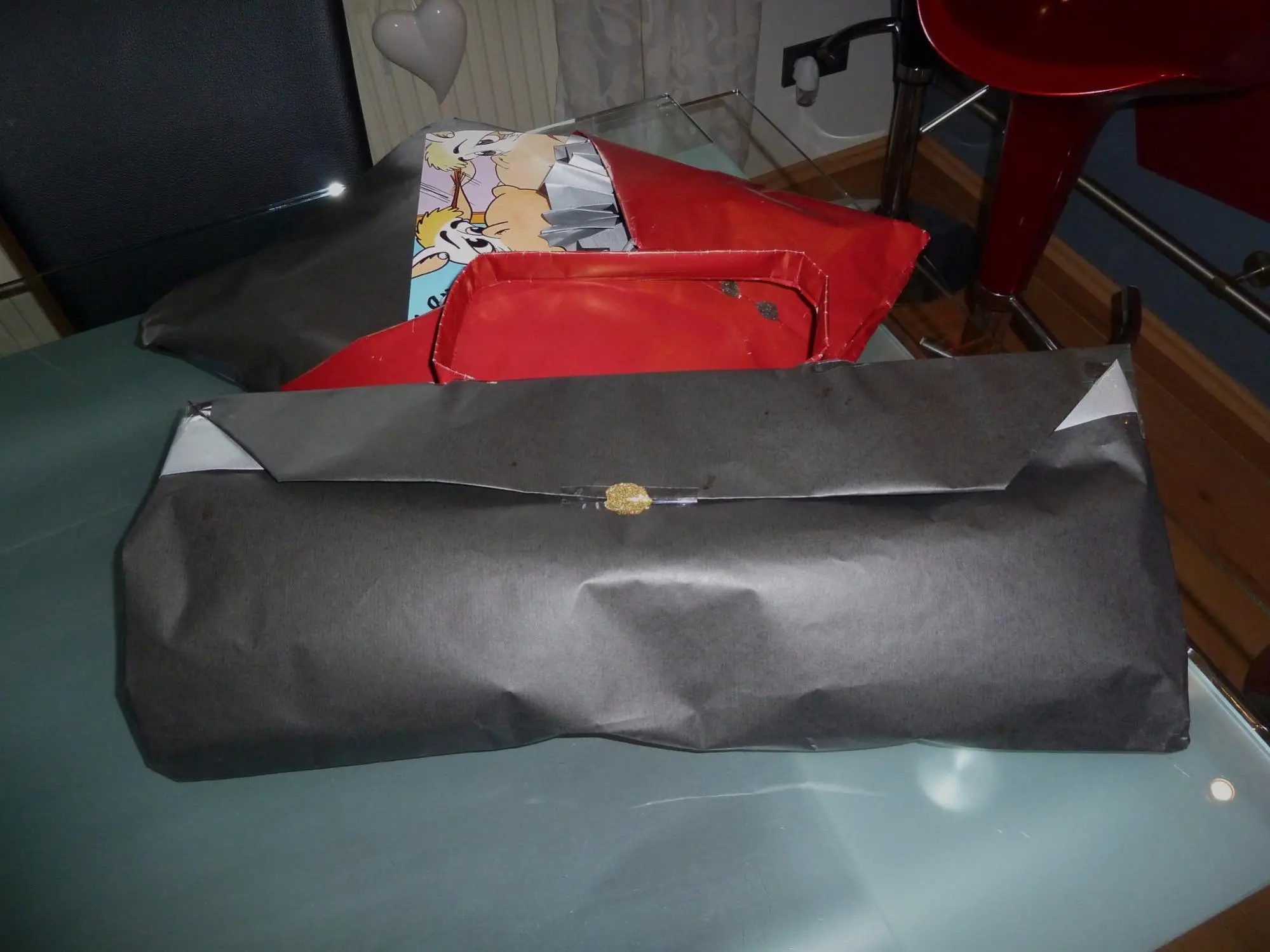 Ich habe für eine Freundin - die heut Geburtstag hat - zwei Päckchen gepackt. Sie steht erstens total auf rot und schwarz und auf Handtaschen.