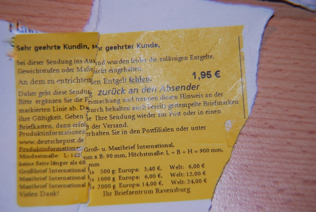 Hab ich gefragt was das soll ,die kostet doch 1,95 laut Zettel der auf dem Umschlag klebte ,Der Postbeamte hat nochmal überprüft und : nein 90 Cent ist richtig nun darf ich ihm das nächste mal den gelben Zettel zeigen er glaubte es auch nicht! Naja hatte ihn schon im Altpapier zerrissen, aber wieder gefunden.