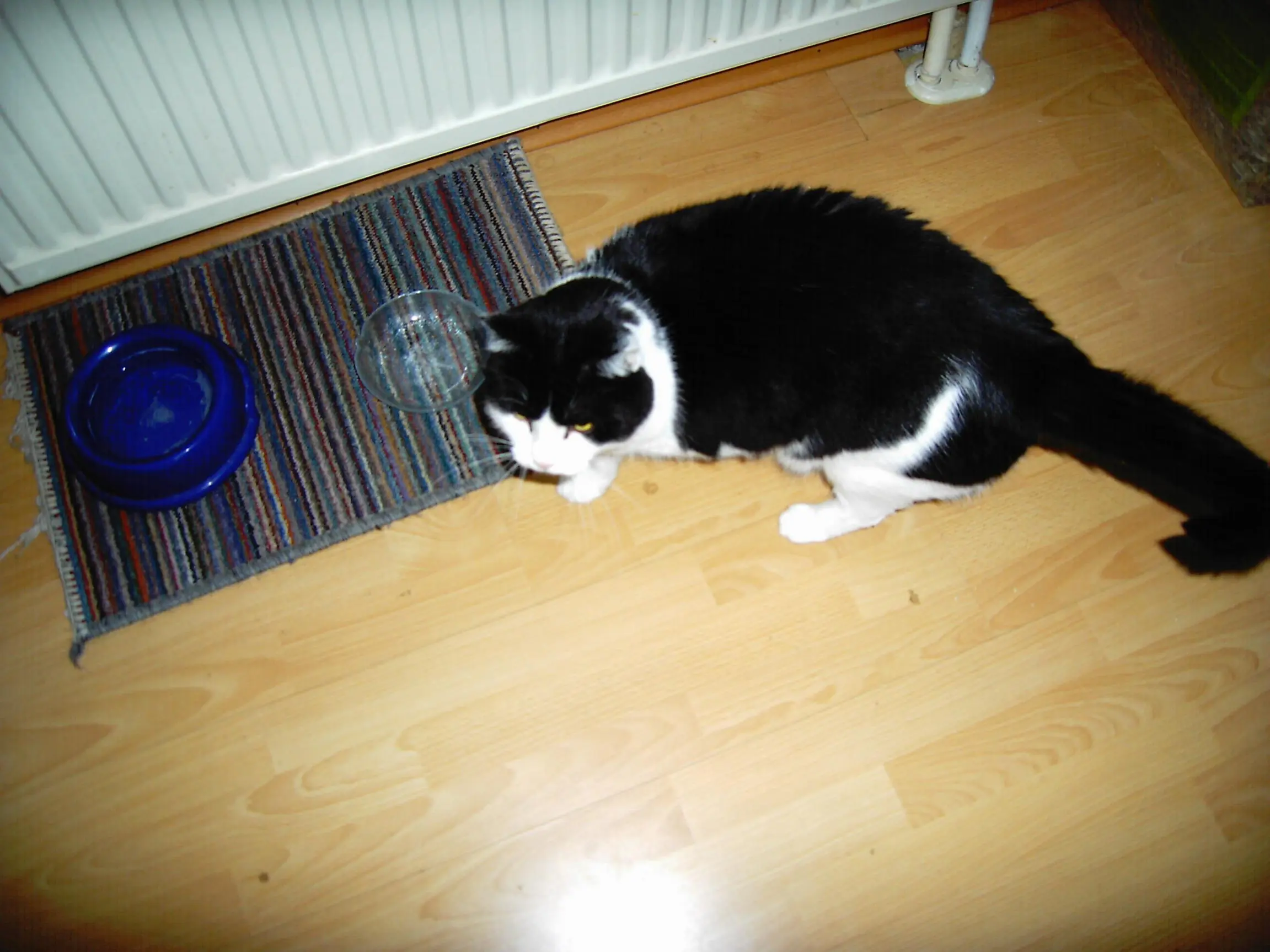 Ich hab einen schwarz-weißen Kater, der mir überall hin folgt, außer wenn er schläft/frisst, dann halt nicht.