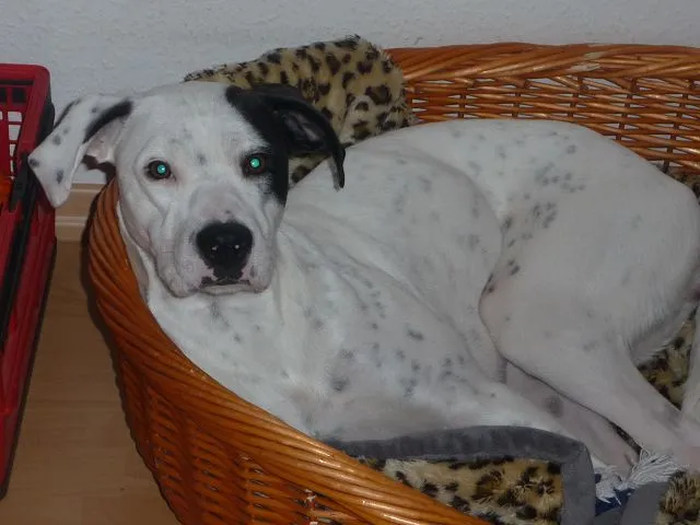 Nanni, die gefleckte Hündin kommt vom Tierschutz. Sie wird im Mai zwei.