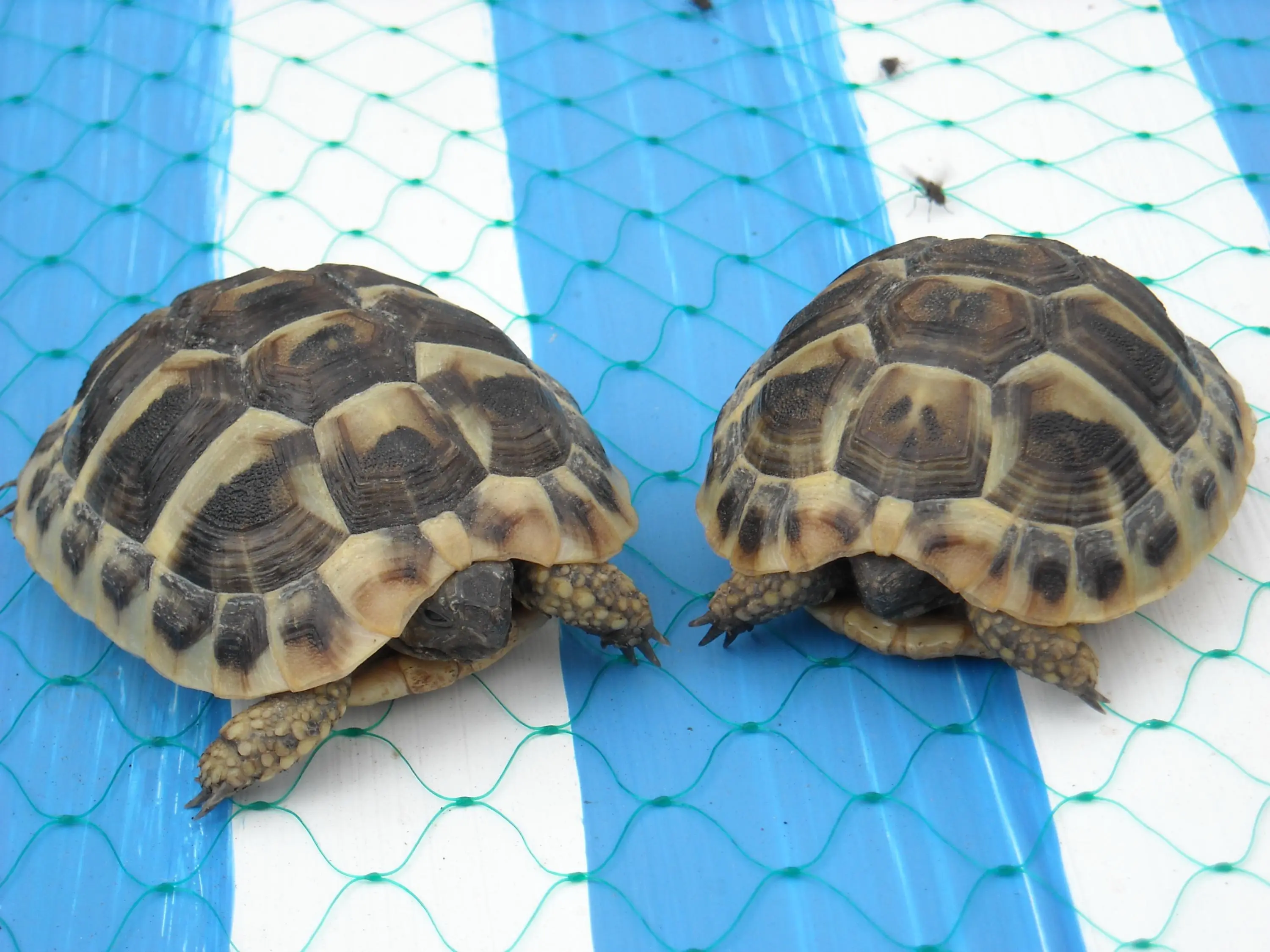 Und das sind Aphrodite und Artemis, meine 1 1/2 Jahre alten griechischen Landschildkröten, die gerade ihren ersten Winterschlaf im 6° kalten Kühlschrank verbringen