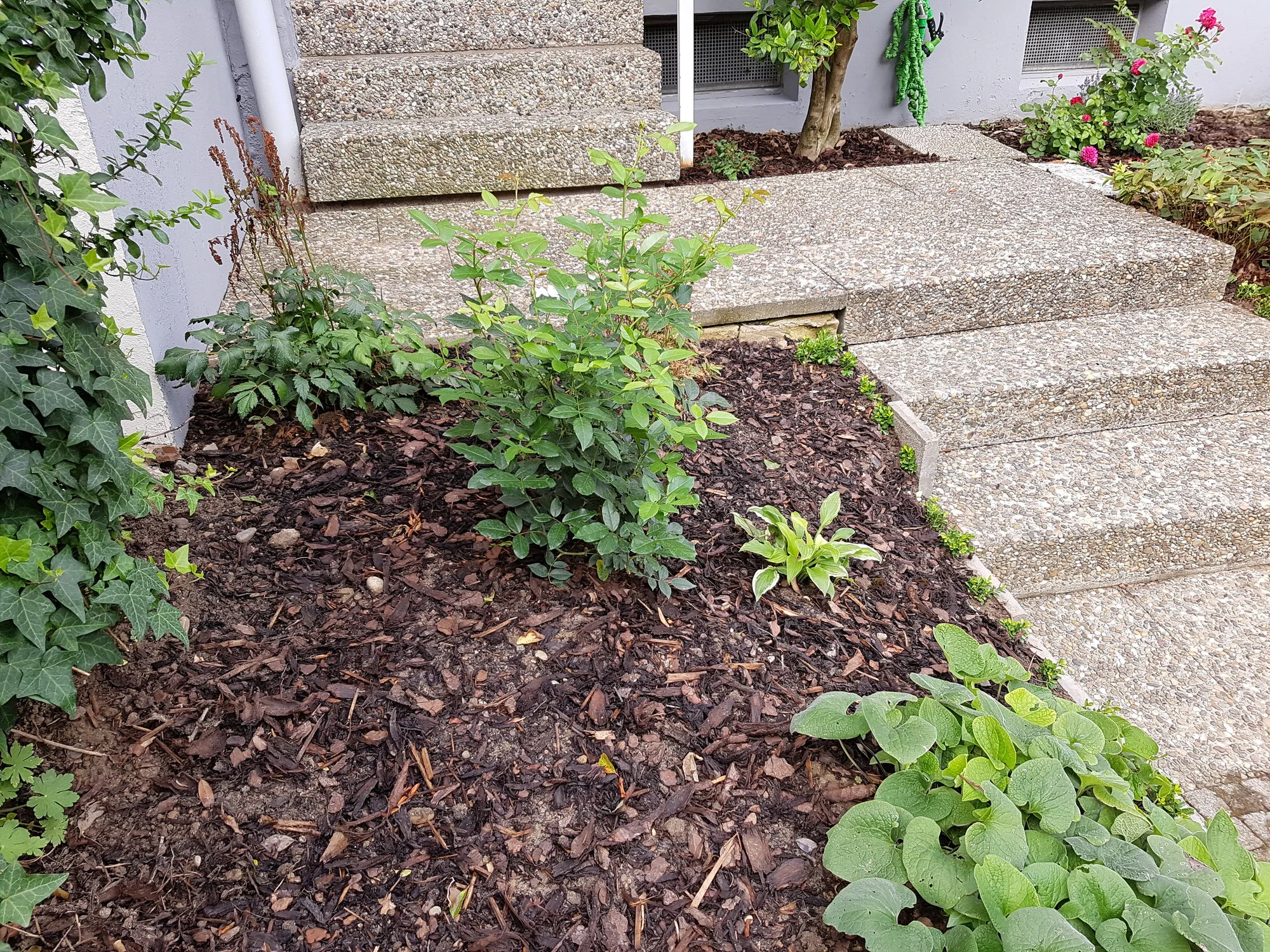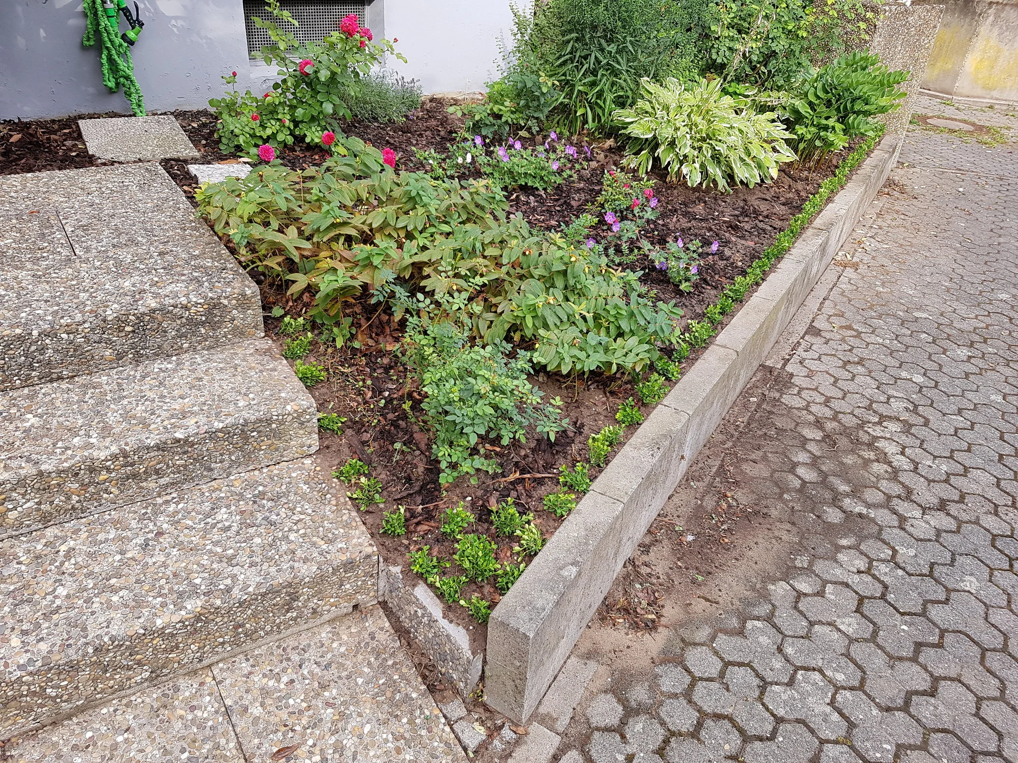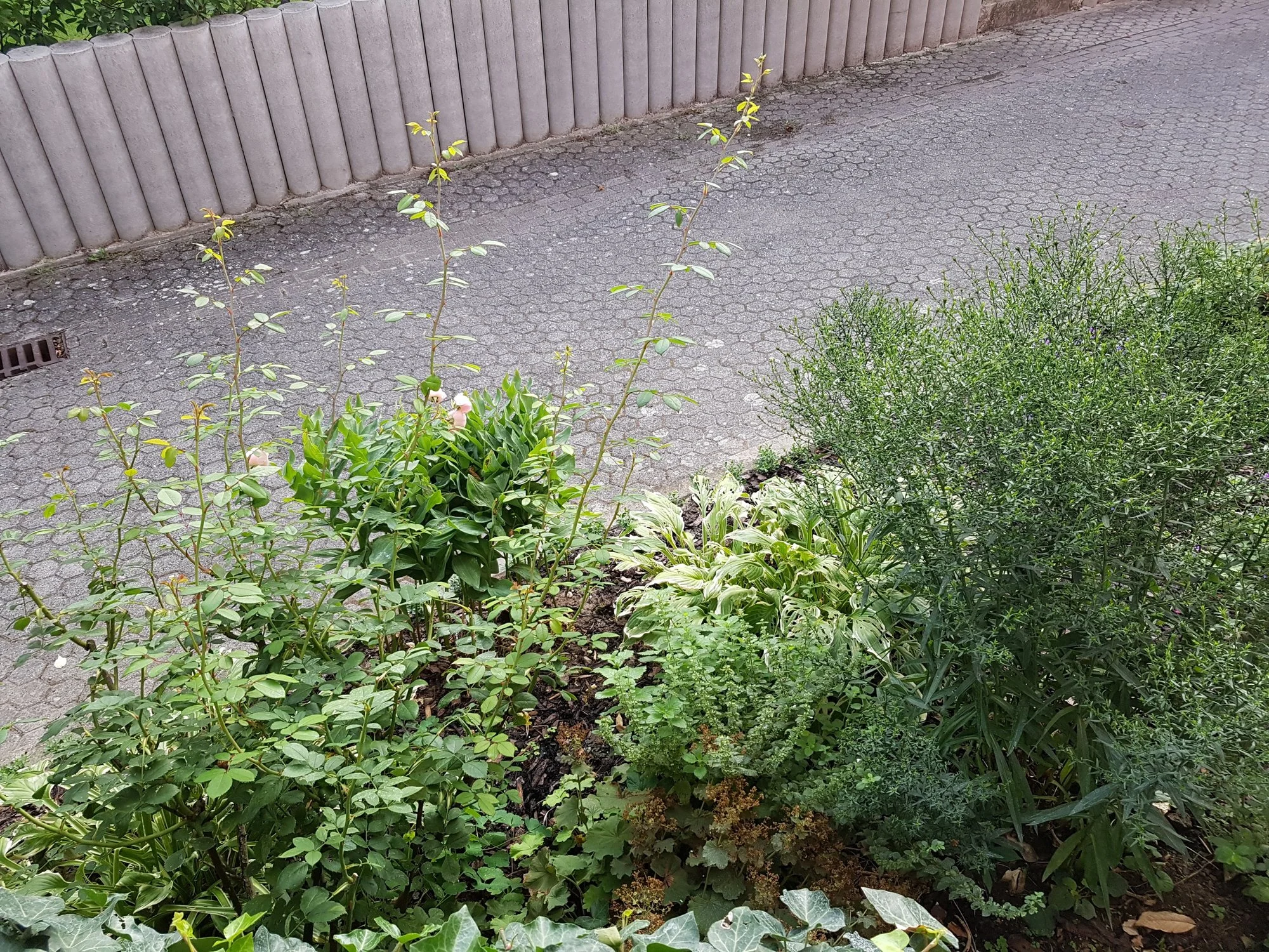 Auch meine 10j alten "mini Rosen" treiben aus wie irre. Direkt vorne an der Treppe: Zwergrose Lupo (Lilla flache Blüten), die hat Teils 1m lange Triebe bekommen!! Vonwegen Zwergrose.. Schnibble da ständig.. Dahinter weiter rechts ist die "Zwergrose Sonnenröschen". Die ist auch gar nicht mehr so "zwergig" sondern treibt aus wie irre und das eher als Bodendecker als als mini Strauchrose.. Hat aber super süsse klene weisse Blüten wobei es davon noch sehr wenige gab..