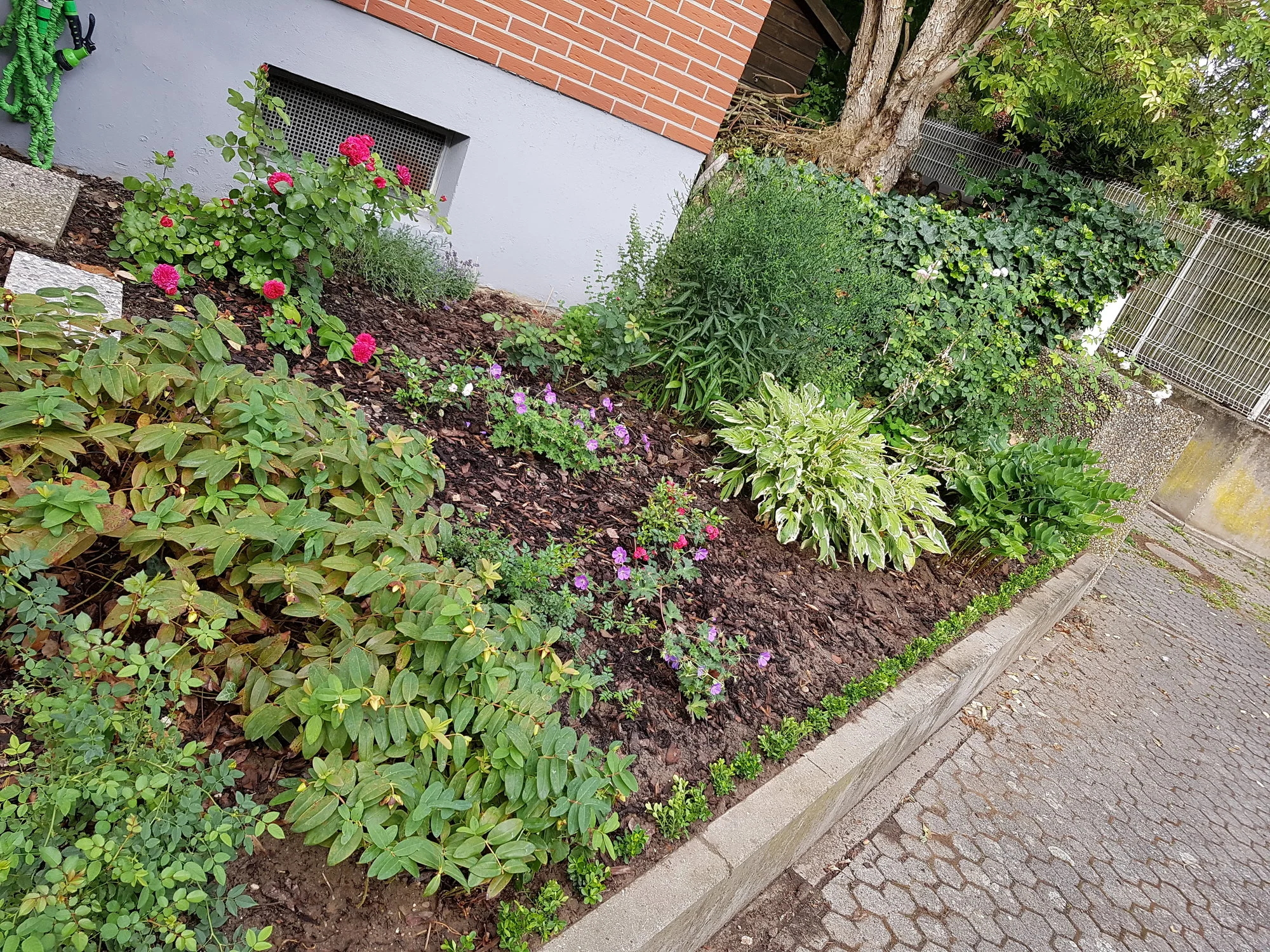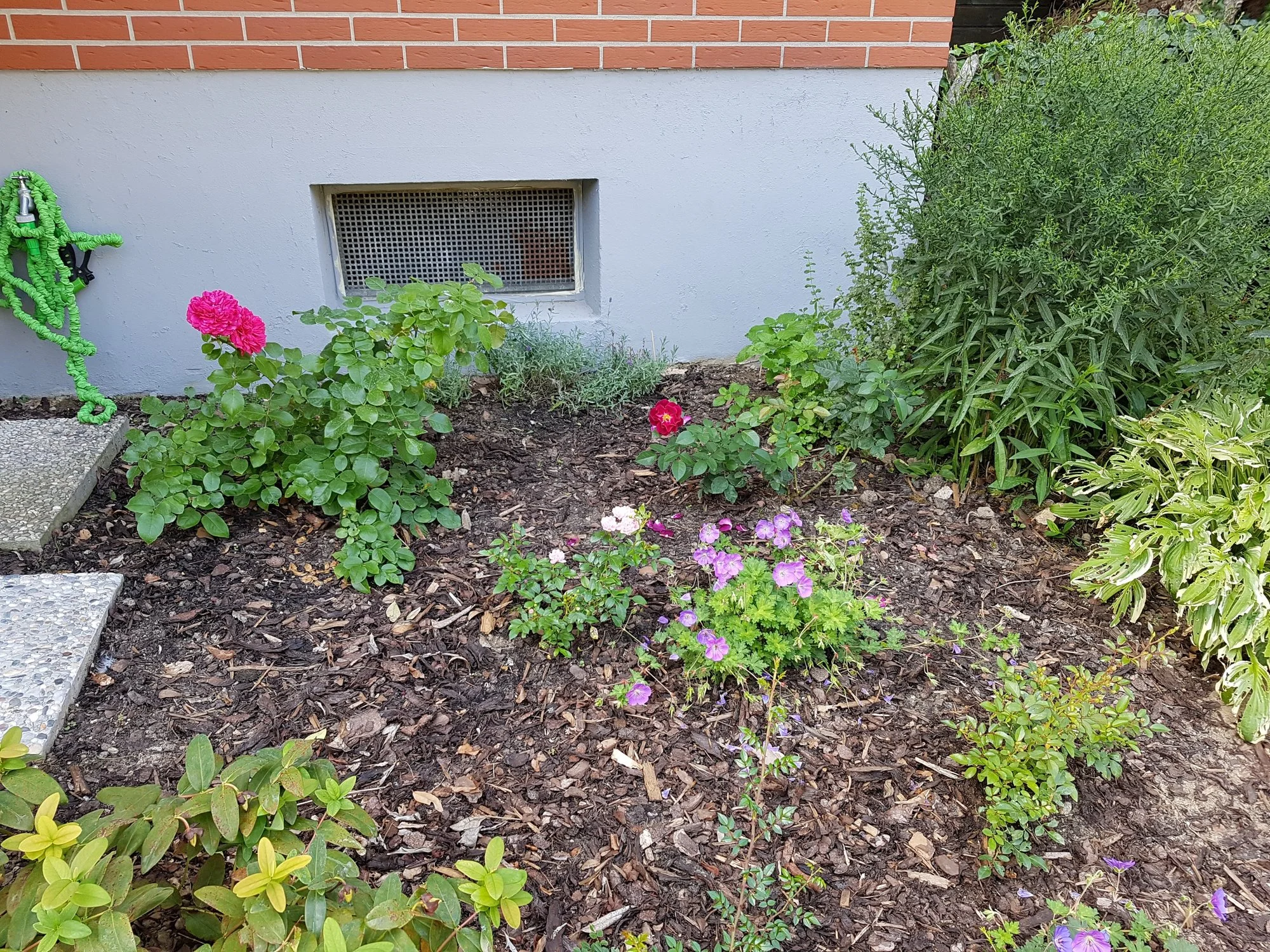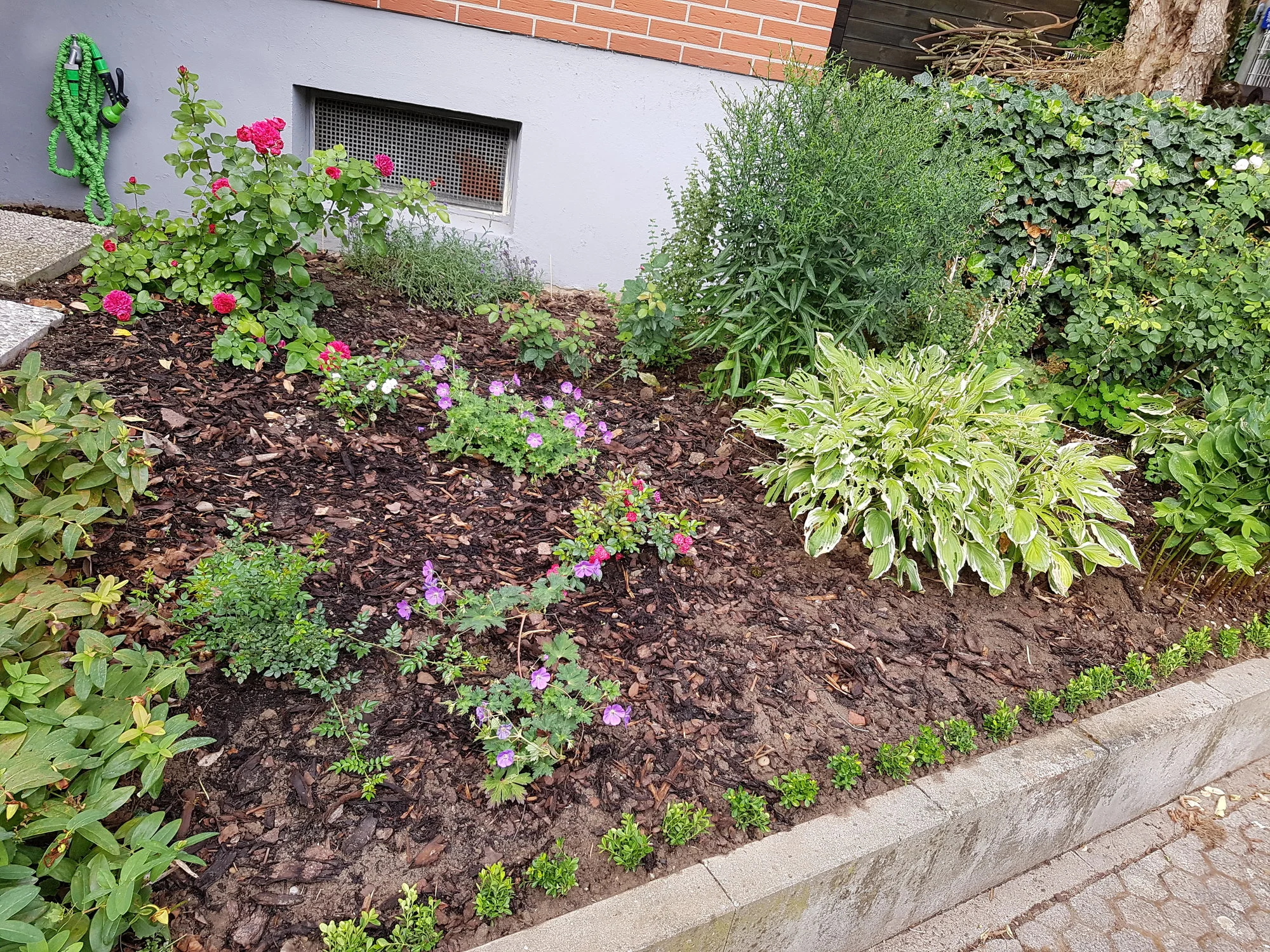 Ausser das eine Nachbarskatze ständig in meinem Lavendel hinten am Kellerfenster "badet" hmpf.. Ich wunderte mich wieso der mittlere so kränkelt aber dann erwischte ich das Vieh mal.. Naja.. Irgendwo da rechts kommt die Tage noch eine orangene Rose "Westerland". Die 2x Rozanne blühen hammer genial und ständig