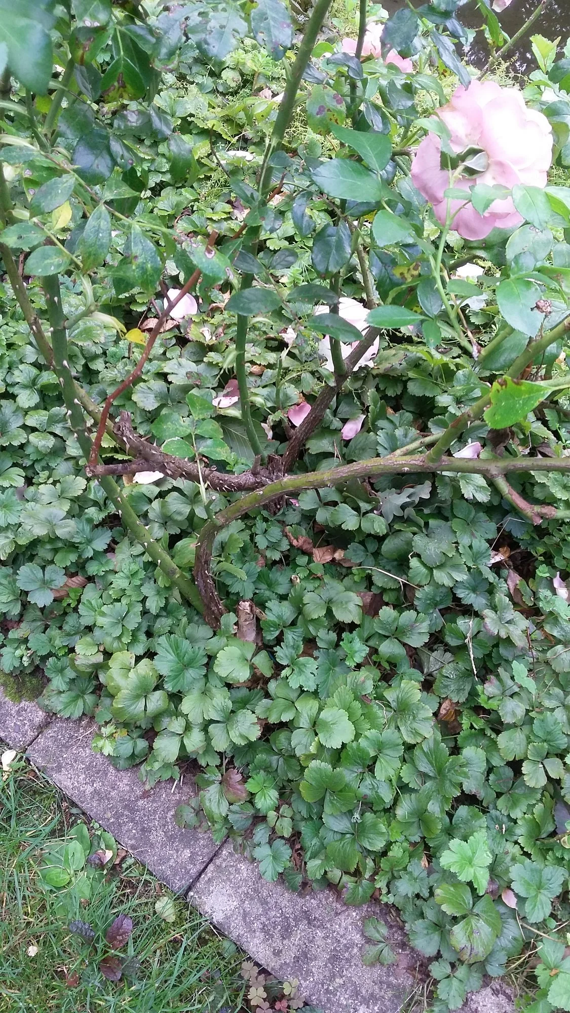 In Härtefällen habe ich da ein bißchen Hornspäne um die Rosen gestreut, 3-4 Lagen Zeitungspapier drauf gelegt und dick Rindenmulch drauf gepackt. Hat den Rosen überhaupt nicht geschadet und im Jahr drauf konnte ich die Unkrautreste leicht entfernen. Dann kannst Du einen Bodendecker pflanzen. Der sollte den Boden gut abdecken ohne die Rose zu sehr zu bedrängen. Meine Favoriten dafür sind derzeit : Blauer Bubikopf (Isotoma fluv.) , Spanisches Gänseblümchen (Erigeron karvinskianus) oder niedrige Storchschnabel-Sorten, z.B. "Purple Pillow" oder "Apfelblüte". Aber natürlich gibt es da noch viele andere ....