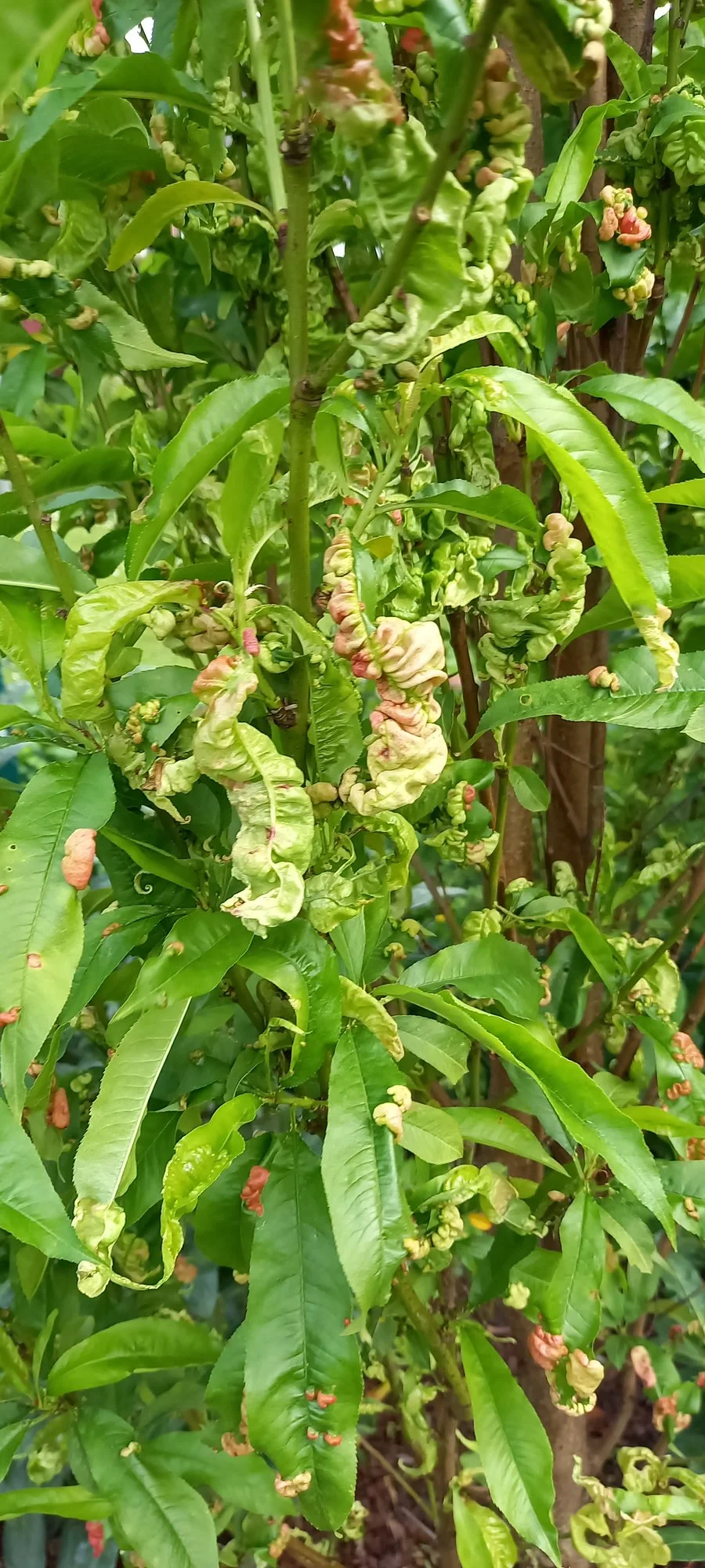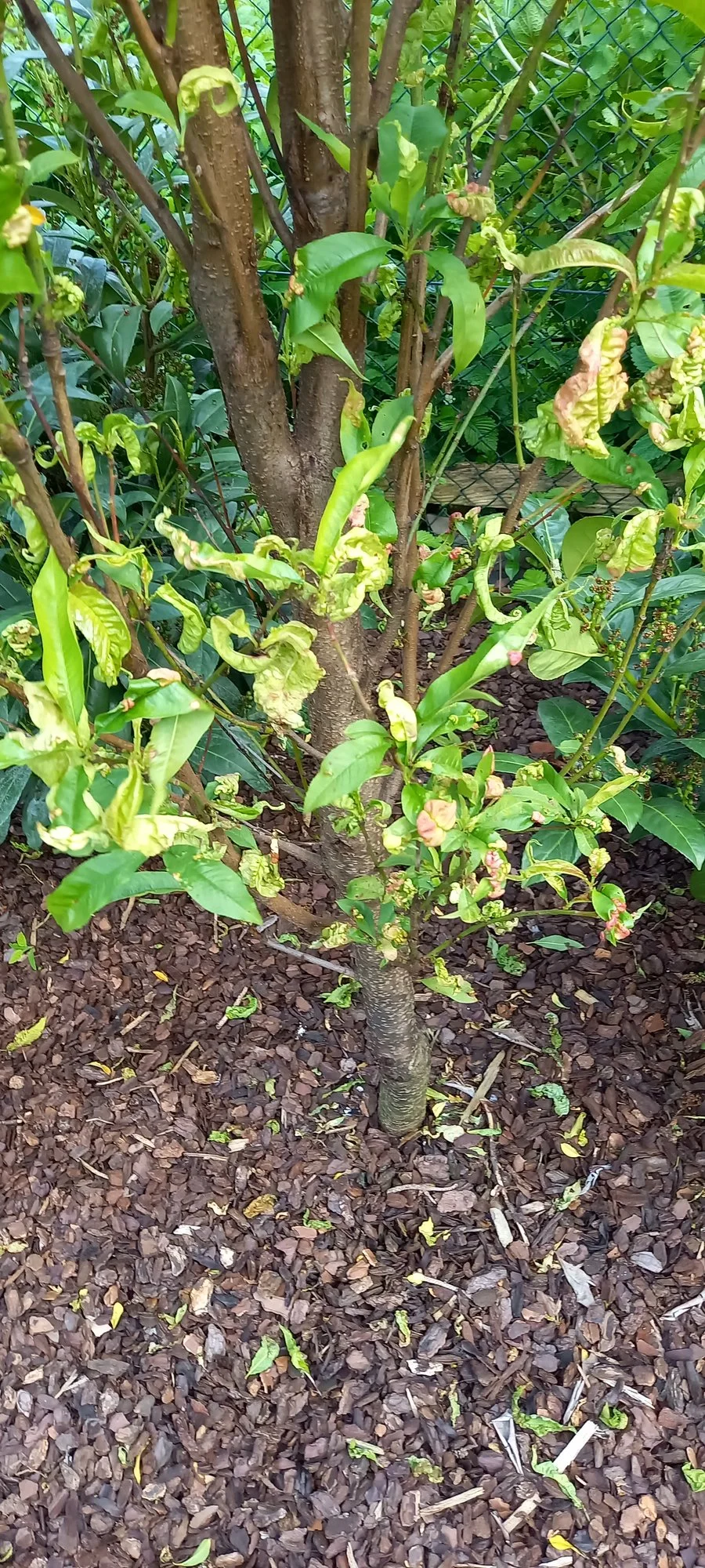 Und obwohl ich dieses Jahr nicht gespritzt hatte, weil ich meine Nektarine ja ausmachen wollte, habe ich richtig viele Früchte dran. Wobei die teilweise auch richtig heftige Blasen drauf haben. Eigentlich heißt es ja, der Pilz geht nicht an die Früchte, aber das beobachte ich dieses Jahr leider anders.