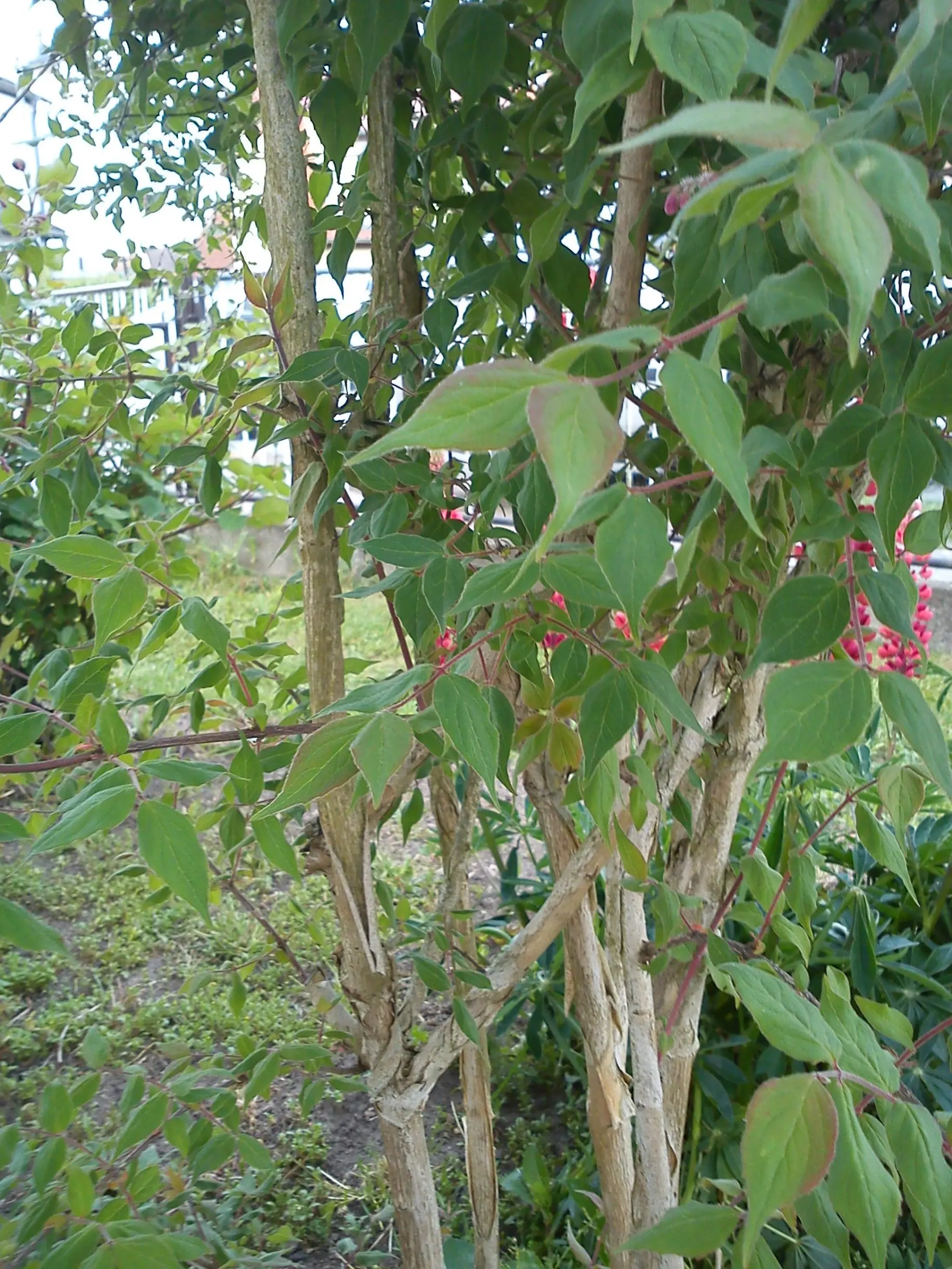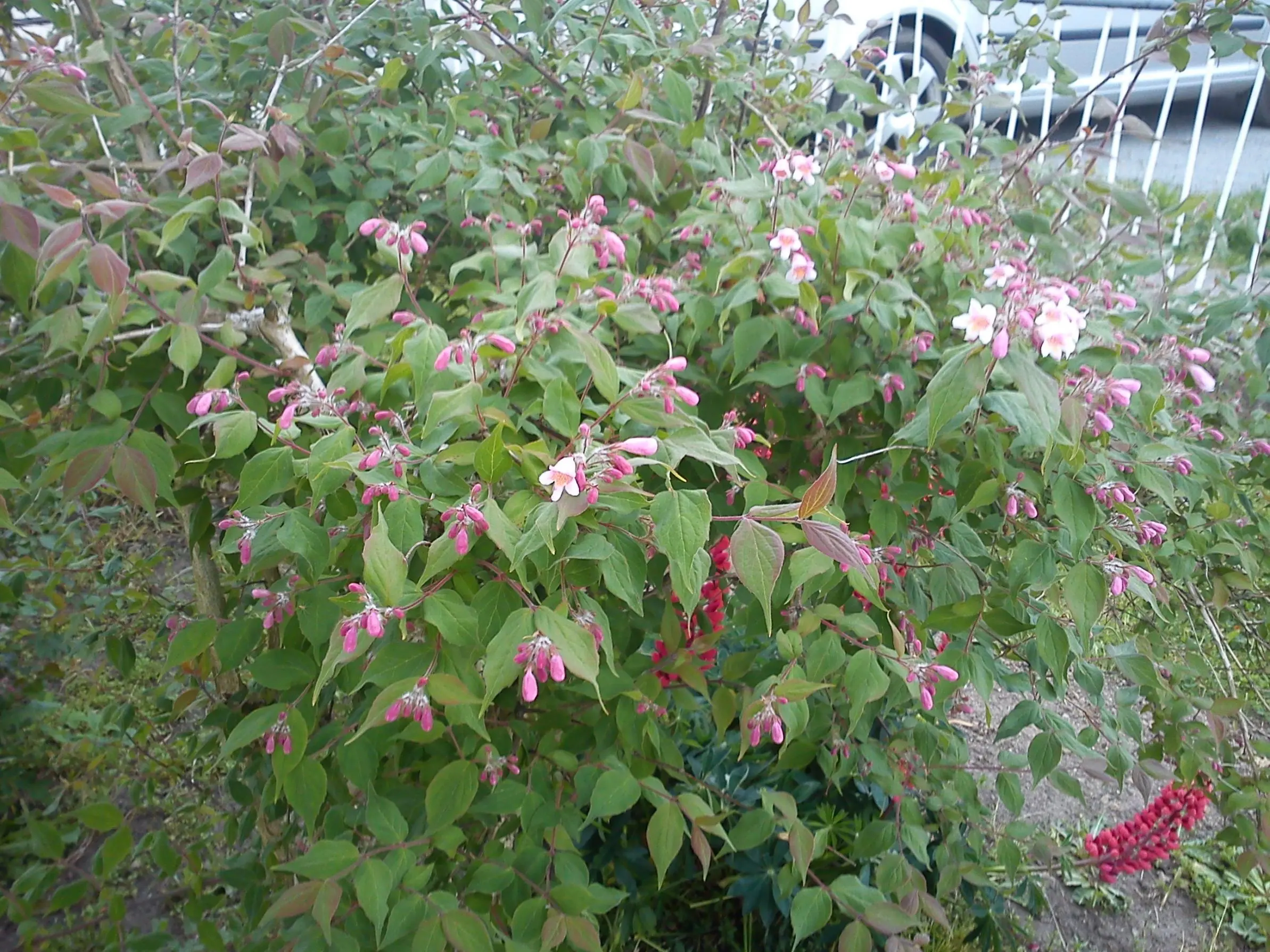 ich bin der Meinung, daß der große Strauch eine Kolkwitzie (Perlmuttstrauch) ist. Blätter, Stengel und Blüten sind identische mit meiner Kolkwitzie im Garten.