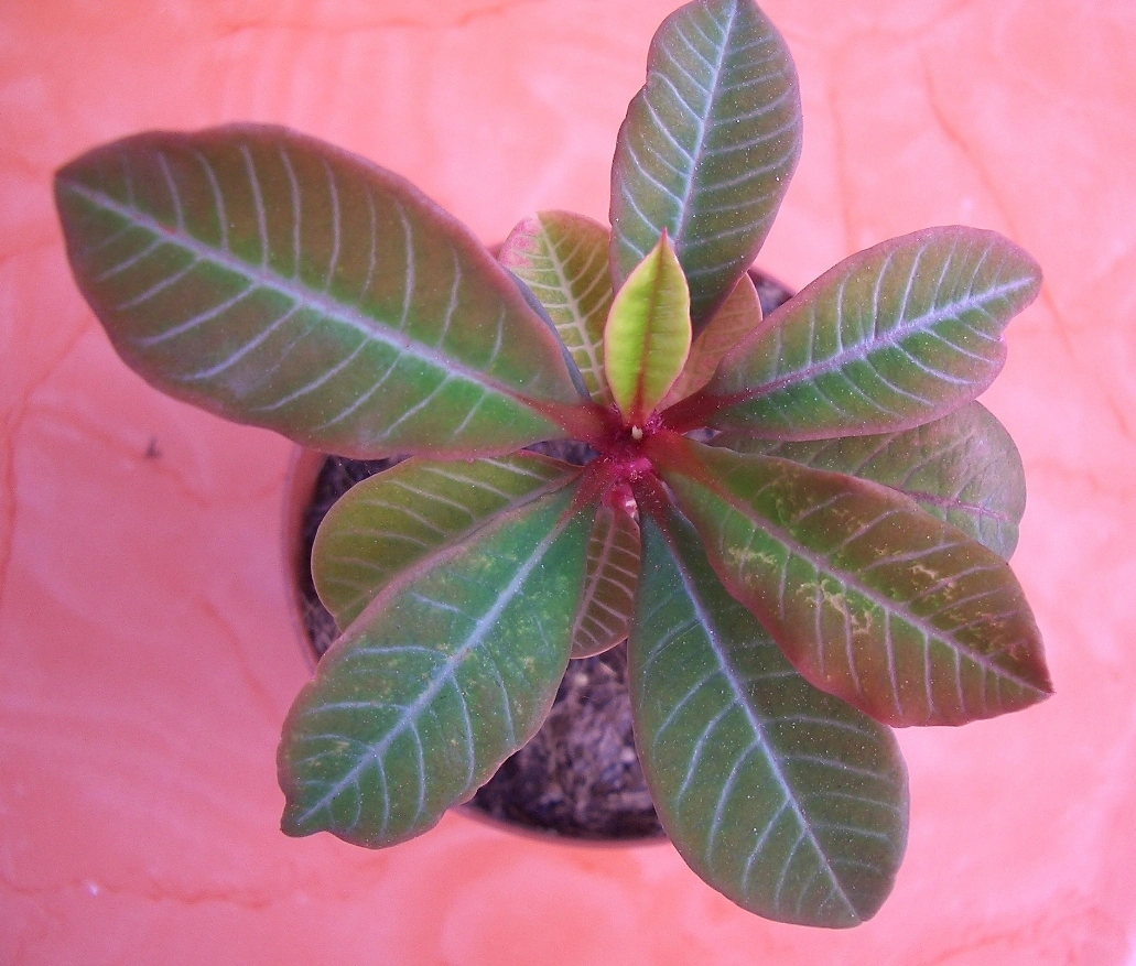 Ich meine, es ist doch Euphorbia leuconeura. Blattform, Blattzeichnung, rötliche Blattunterseite, rötliche Blattstengel - das kommt alles hin und passt besser als alles andere (es sei denn, Lila kommt jetzt mit 'nem Kaninchen aus'm Zylinder... aber sie sagt ja nix). Und es ist noch ne junge Pflanze, sicher noch nicht ganz typisch.