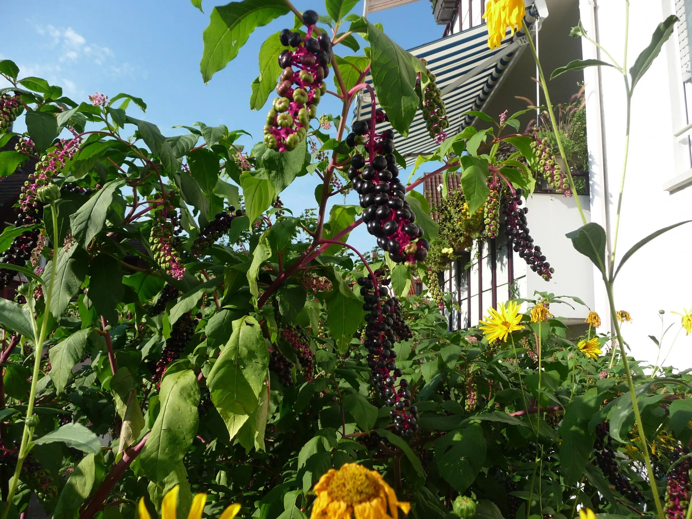 • Hi, die mit den hängenden Blüten-/Fruchtständen sind Amerikanische Kermesbeeren (Phytolacca americana).