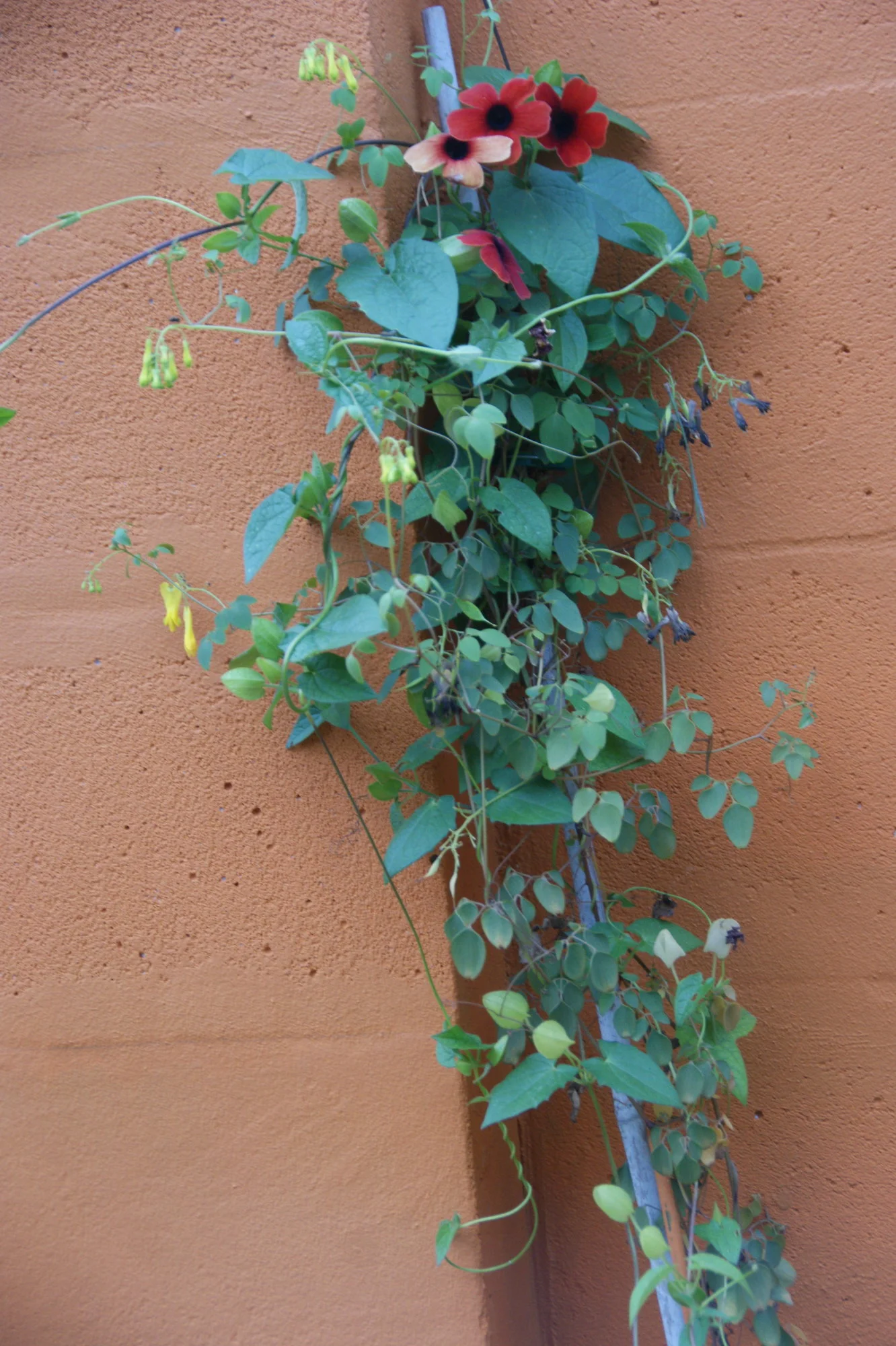 Das kletternde tränende Herz hat sich mit der Schwarzäugigen Susanne zusammen getan und ist toll am wachsen und blühen.