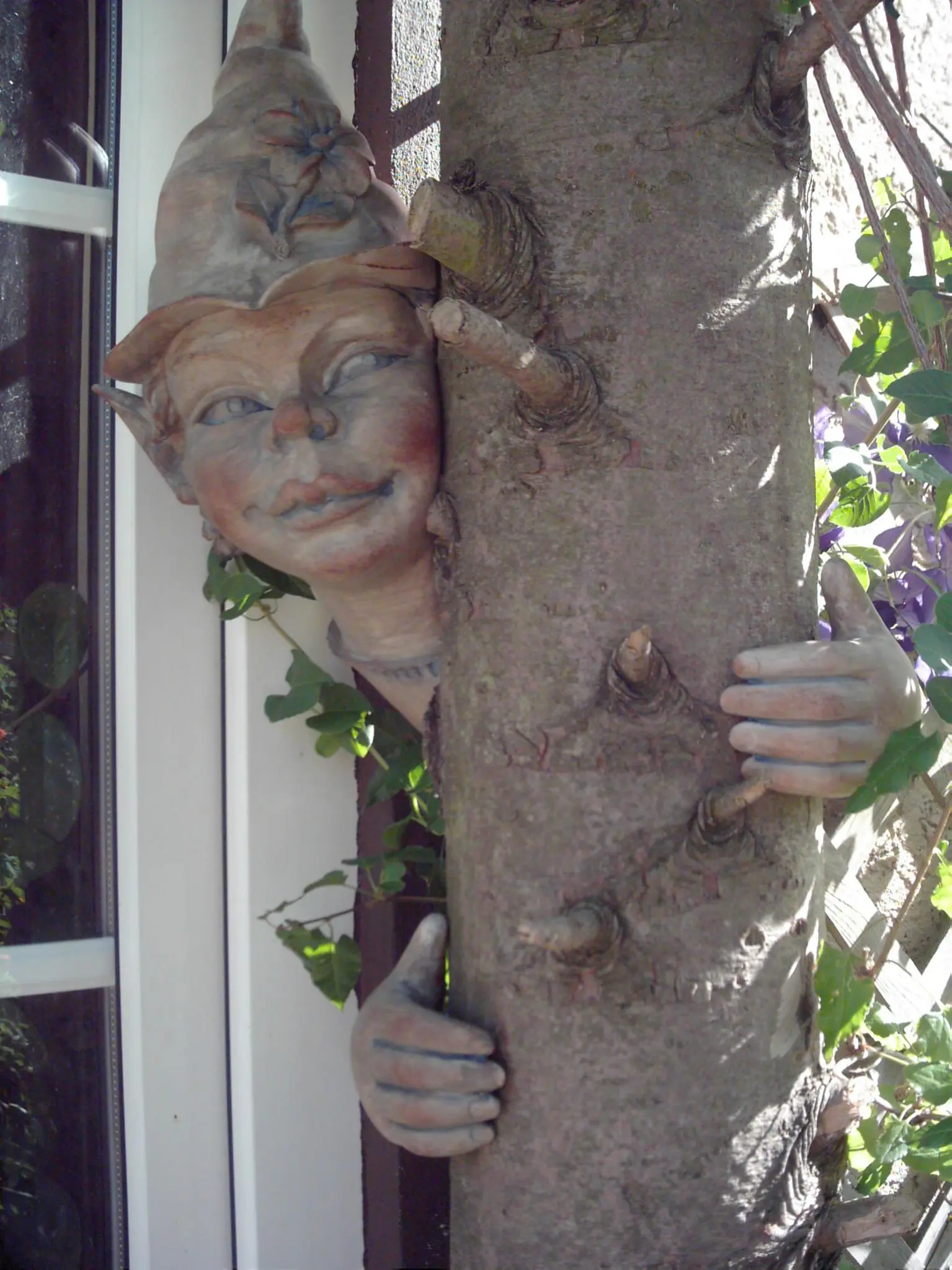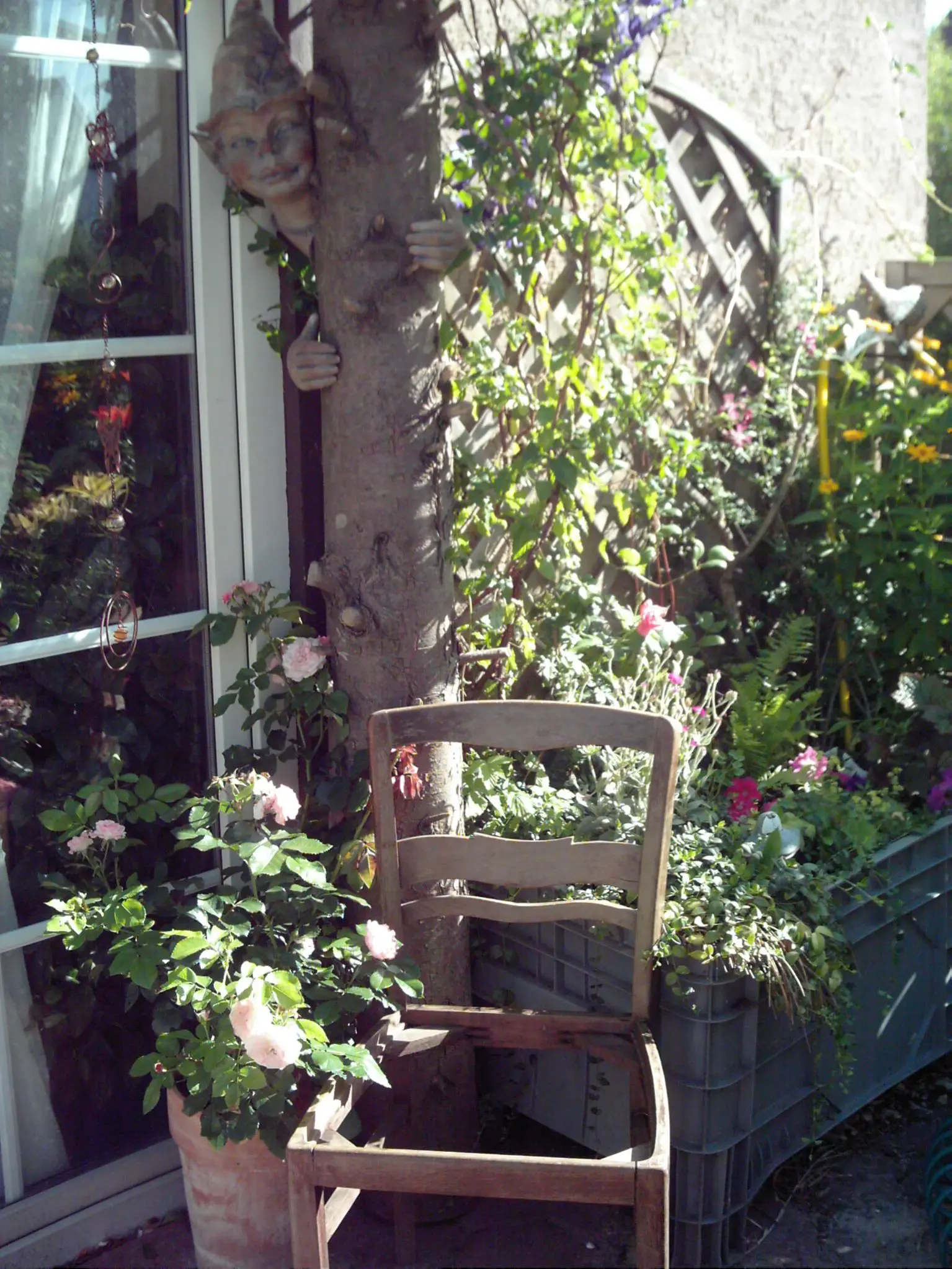 Bin grad dabei eine neue Ecke zu gestalten. Baumstamm steht - Elf ist auch montiert.... Der große Kübel im Hintergrund wird noch mit Holz verkleidet und der alte Stuhl, den ich auf dem Flohmarkt ergattert habe, bekommt noch ein Kleid aus Moos und wird auf der Sitzfläche mit Efeu bepflanzt.