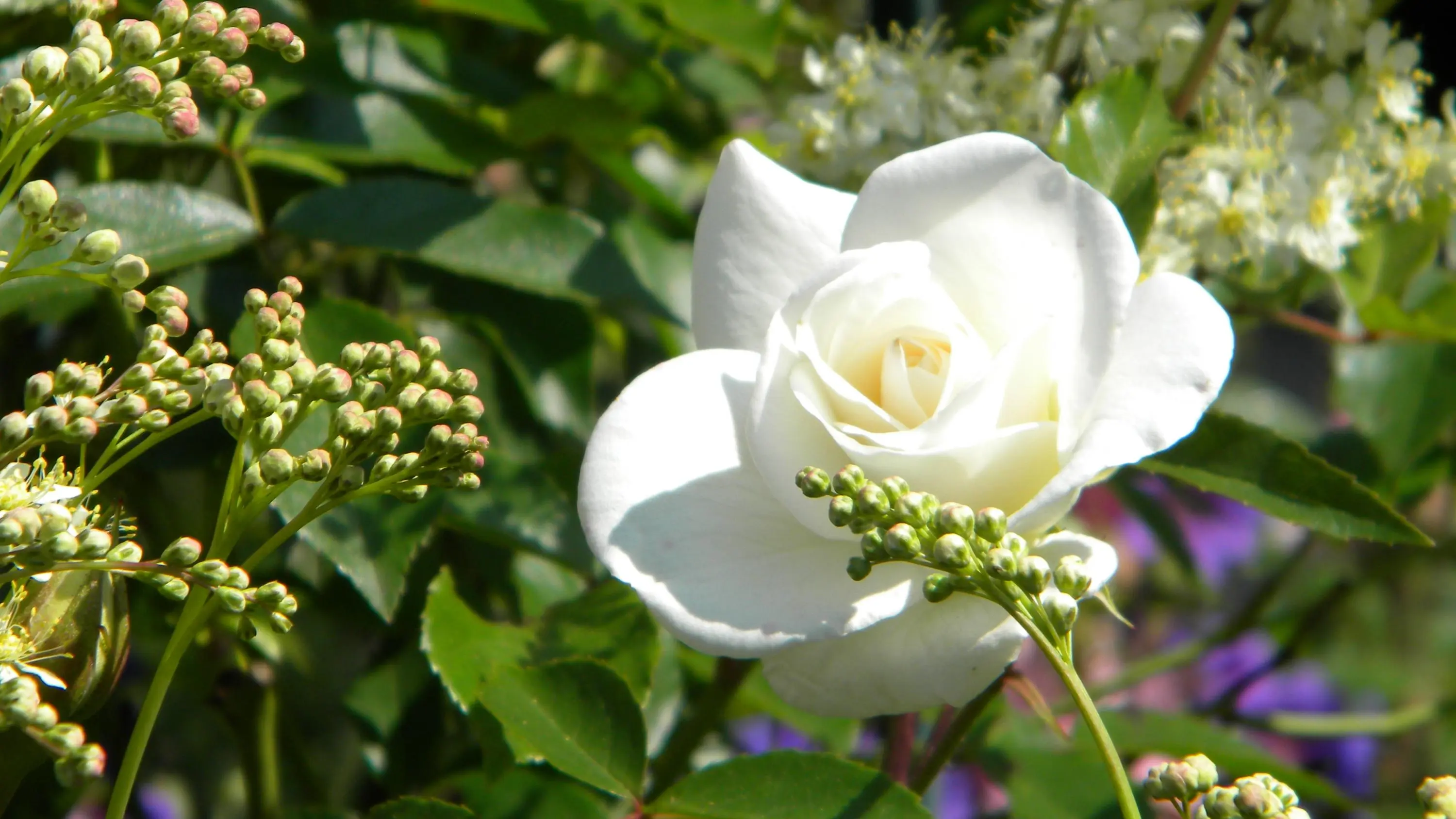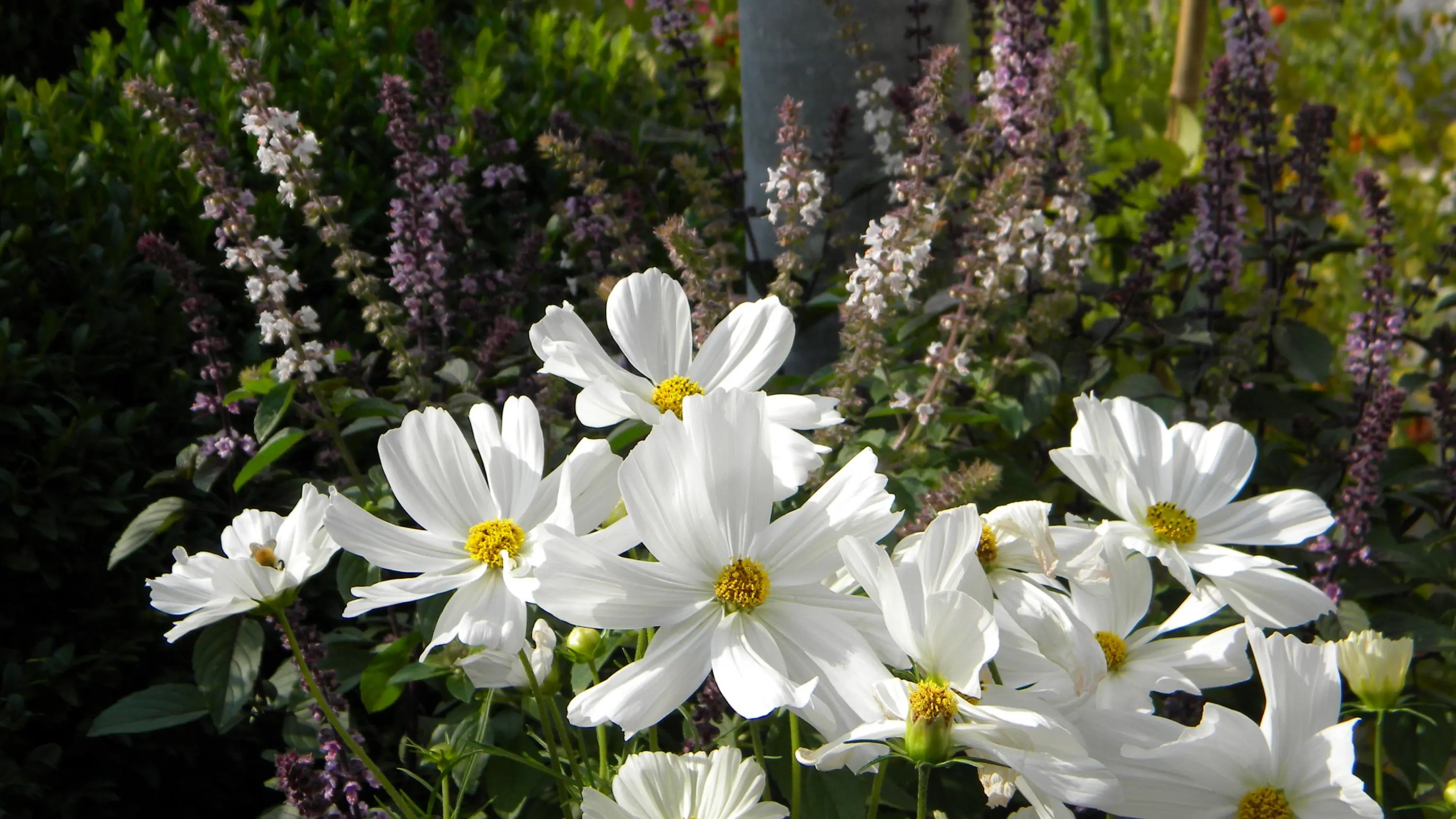 2m hohes Schneewittchen, daneben 1m hoher lila Rhododendron und darunter