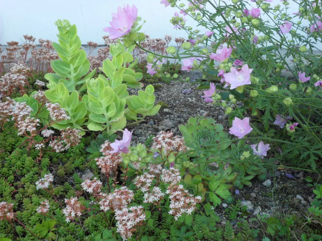 Die Thüringer Lavatere rechts hat selbst hergefunden. Ansonsten sind da noch Hauswurz, Mauerpfeffer und Fetthenne. Eine Steingartenecke en miniature.
