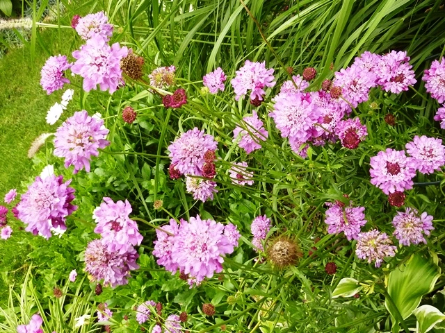 Zu sehen sind Alstromeria, Echinacea, blaue Duftnessel, Herbstanemone, Skabiosen und im Hintergrund Gartenhibiskus in rosa, weiß und blau