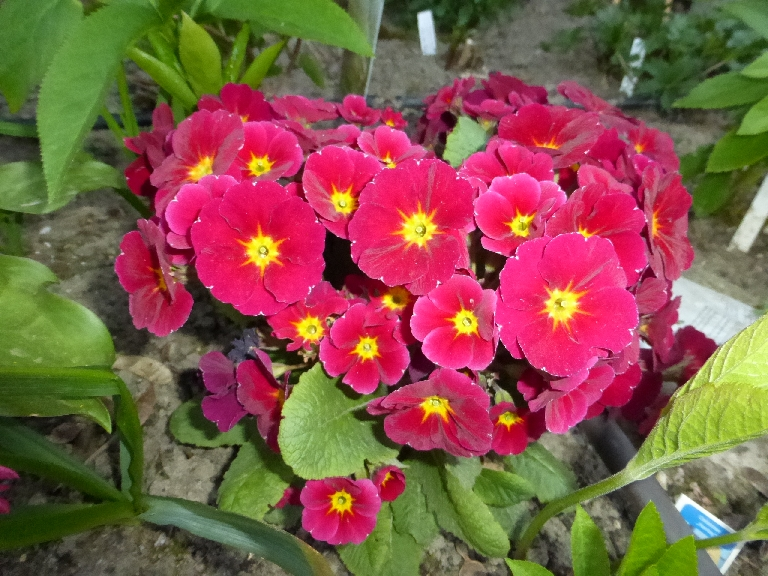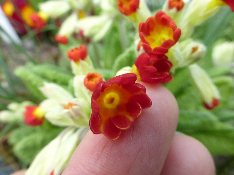 Diese rotgelbe Tigerprimel hat eigentlich hohe dicke Schlüsselblumenstiele. Sie hat aber genügend Sonne und "muss" nicht hoch: