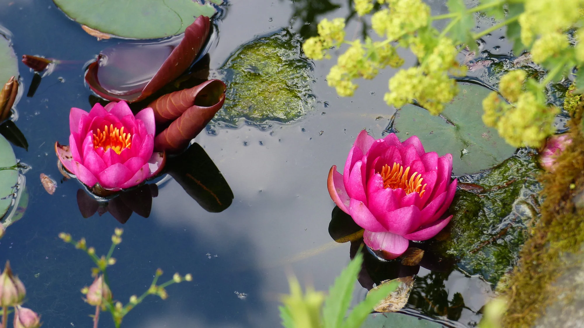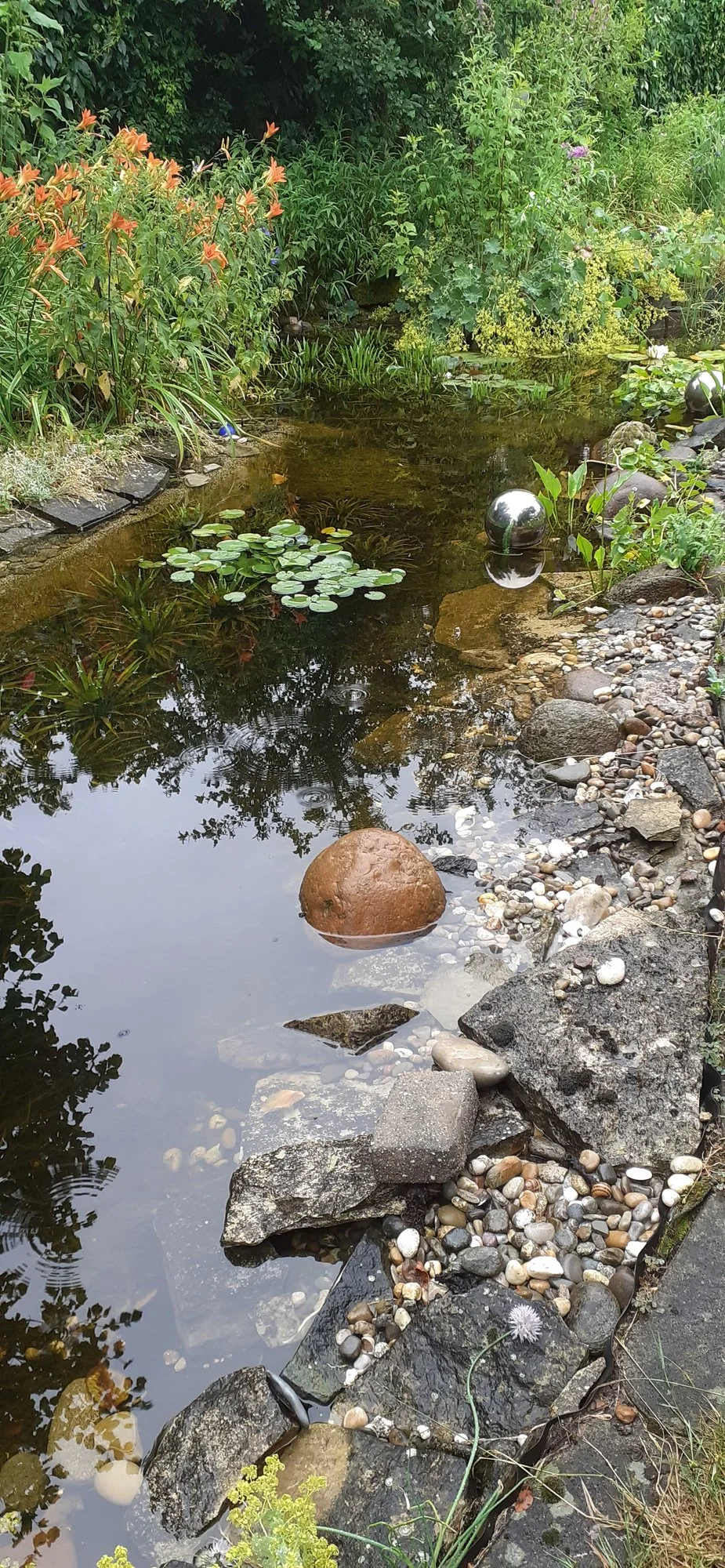 Keine Zwergseerose, aber auch keine für tiefe Teiche (da hab ich eine weiße im unteren Teich) - also ein Mittelding, der obere Teich hat eine Tiefe von ca 50+ cm.