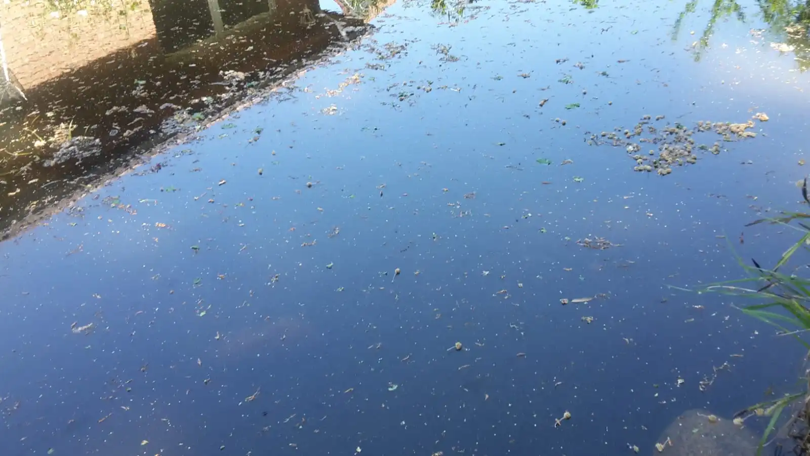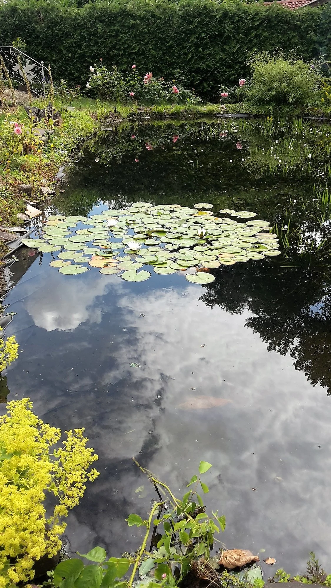 • Hab heut in der Früh am obigen kleinen Teich Algen (kein Wunder bei der Hitze) abgefischt, gar nicht so leicht zwischen den Seerosen, die dort schon üppig blühen,