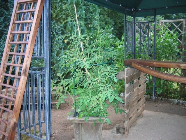 Ich sag nur: wenn ich andere Berichte über diese tolle Tomate vergleiche, sehe ich, daß man schon vor Wochen welche verspeiste. Und meine sind noch sehr, sehr klein. Daa haperts noch a bisserl. Aber das krieg ich mit der Zeit raus, in der Ecke macht sie sich ja toll.