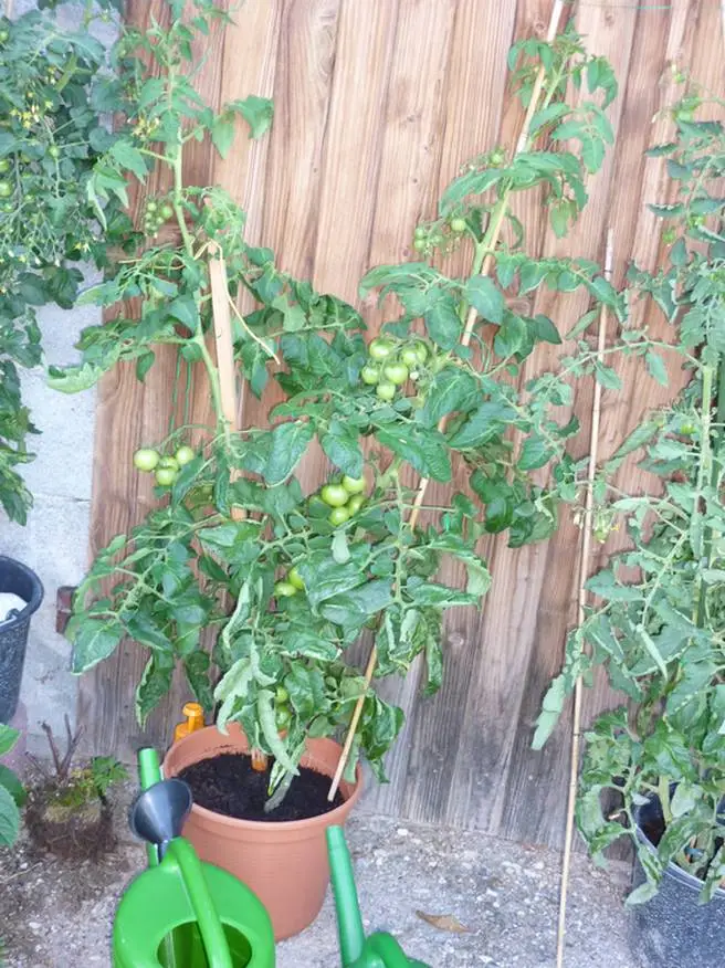 klar-steht jetzt sogar unter dem Dach, da sie leichten Kälteschaden beim letzten Regen abbekommen, hat. Sie hängt voll mit Tomätle und eine verfärbt sich leicht.