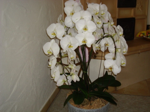 jetzt mach mir mal keine Angst, ich habe eigentlich nicht wirklich Platz für Orchideen und schon garnicht für 45 davon (leider). Ich habe, wie schon gesagt, einen kleinen Wintergarten in dem alles wie Unkraut wächst und demzufolge eine entsprechende Göße erreicht. Da ich nicht der Wegschmeiß-Typ bin, plage ich mich dann mit überdimensionierten Pflanzen herum und es fehlt mir an Platz für Orchideen. Aber, es geht schon los, ich hatte kürzlich Geburtstag und habe prompt wieder 2 geschenkt bekommen. Jetzt wird es in meinem Schweinetrog schon wieder zu eng. Na ja, schaun wir mal.