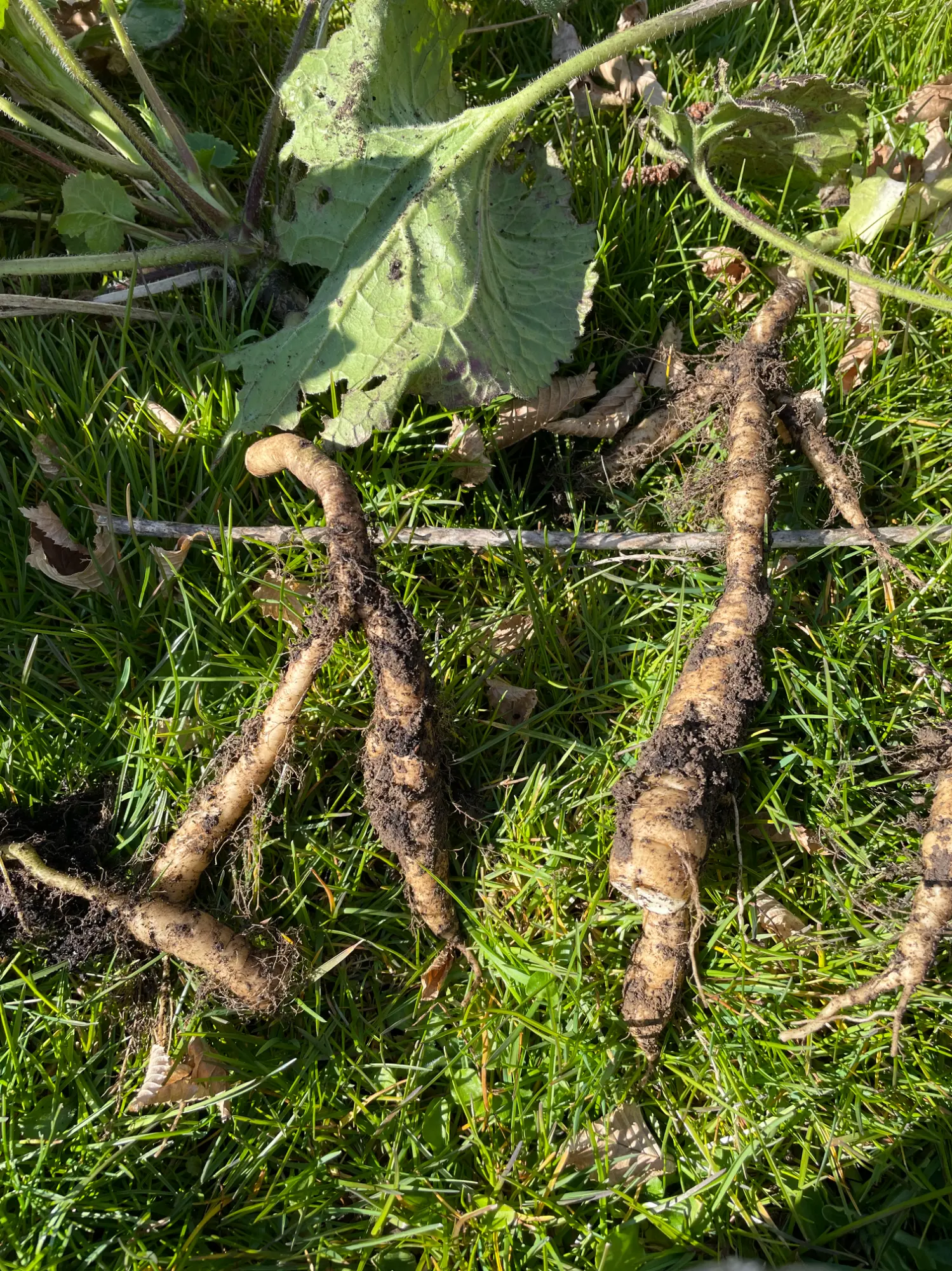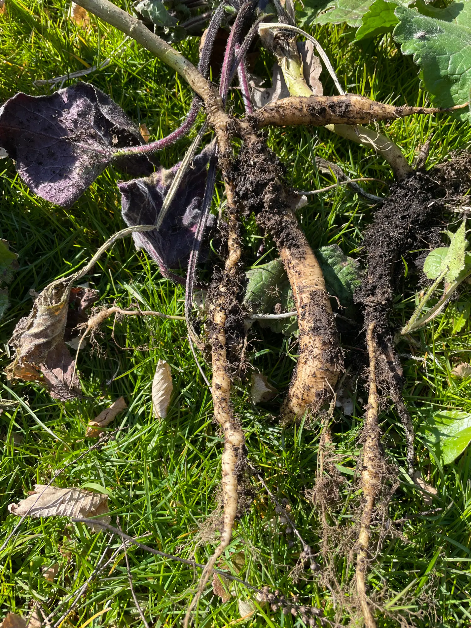 • Lunaria annua kann’s eigentlich nicht sein, einjährige Pflanzen bilden keine Knollen, die @Fjäril auch schon angemerkt hat. Im Internet wird sie einjähriges Silberkraut genannt. Aber im Internet findet man tatsächlich zu Lunaria annua exakt diese verdickten Wurzeln. Dann scheint aber der Beiname „einjährig“ falsch zu sein.